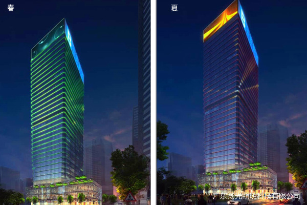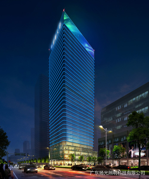 根據(jù)對建筑主體的解析,頂部在西北面設(shè)置的LED顯示屏,東南而設(shè)置企業(yè)LOGO來增強建筑的標識度,立面采用燈管勾勒,有效的表現(xiàn)出建筑龍骨結(jié)構(gòu)的層次感,通過線條變化體現(xiàn)出城市高效發(fā)展的速度。