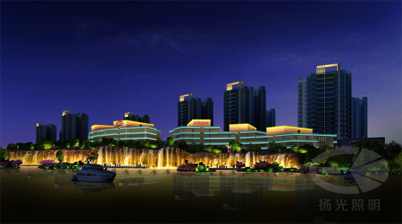 如果是大江大河之類的自然水景,不可能將整個水面點(diǎn)亮,所以主要采取反射岸邊景物,用來凸顯水體的存在和景觀。增加水體的觀賞性,營造夜景的氛圍,一般選用造型別致、隱藏性好的LED作為自然水景的燈具。