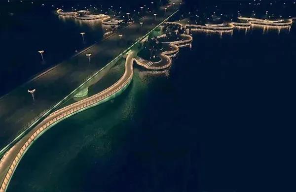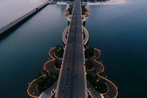 恒大?;◢u1號島入島主橋梁是?;◢u的三個人工島連接陸地側(cè)濱海大道的一條主要通道,橋長608米,寬17米。